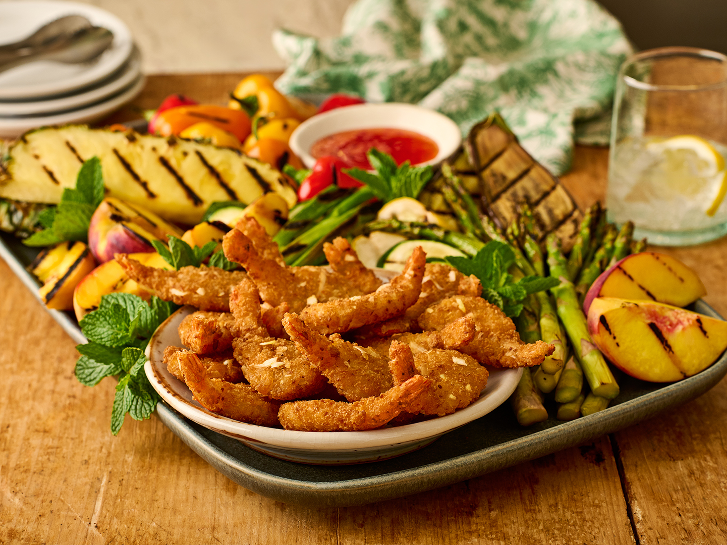 Arrange crispy Coconut Shrimp and grilled produce on a large serving platter. Garnish with fresh mint leaves. Serve immediately with the Sweet Thai Chili Sauce for dipping.