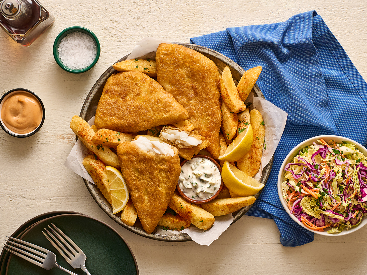 Transfer crispy cod and seasoned fries to a serving platter. Serve with lemon wedges for squeezing over the fish and a generous side of homemade coleslaw.