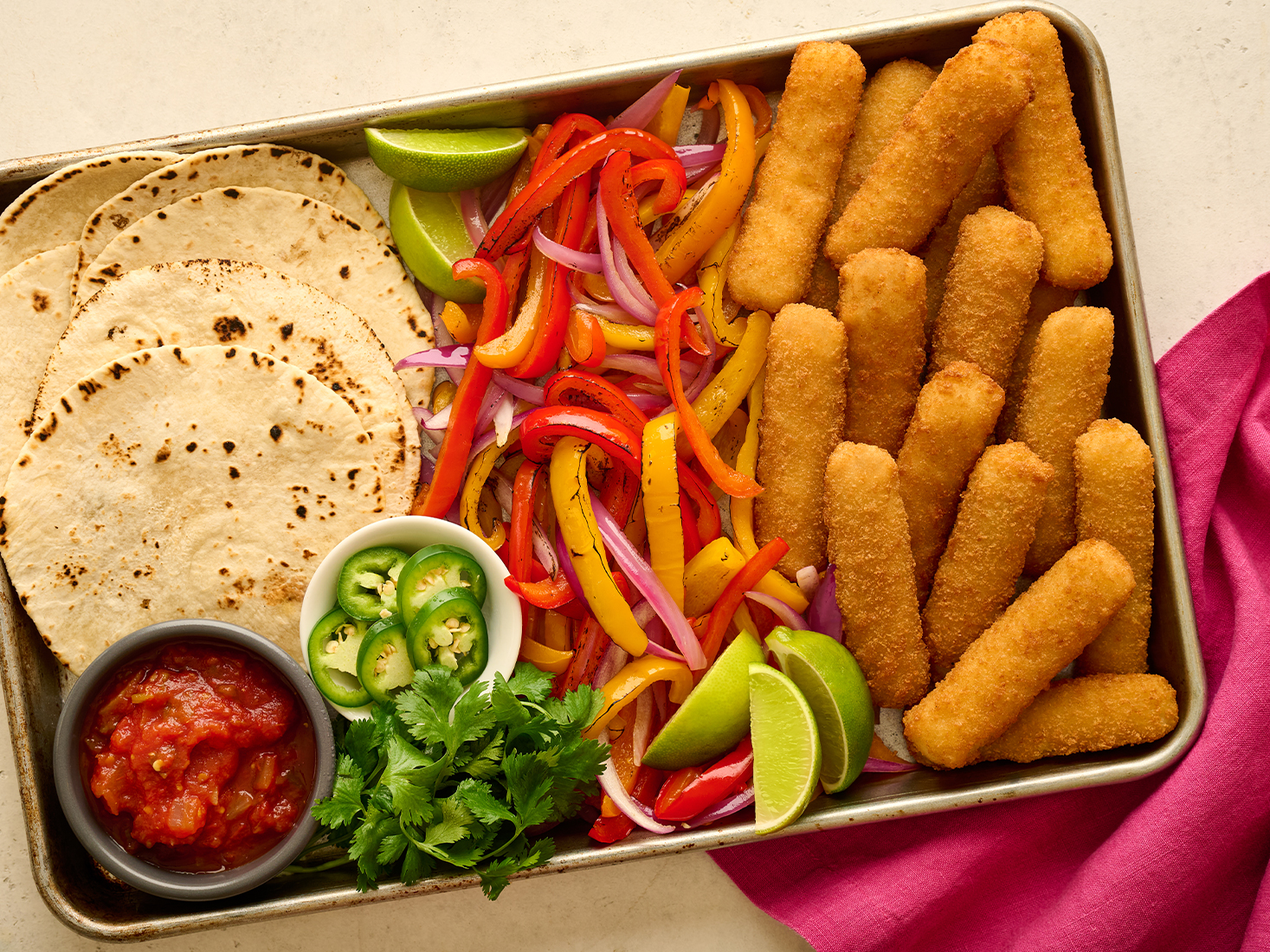 Assemble fajitas by layering roasted vegetables and crispy fish sticks on tortillas. Serve with lime wedges and your favorite salsa.