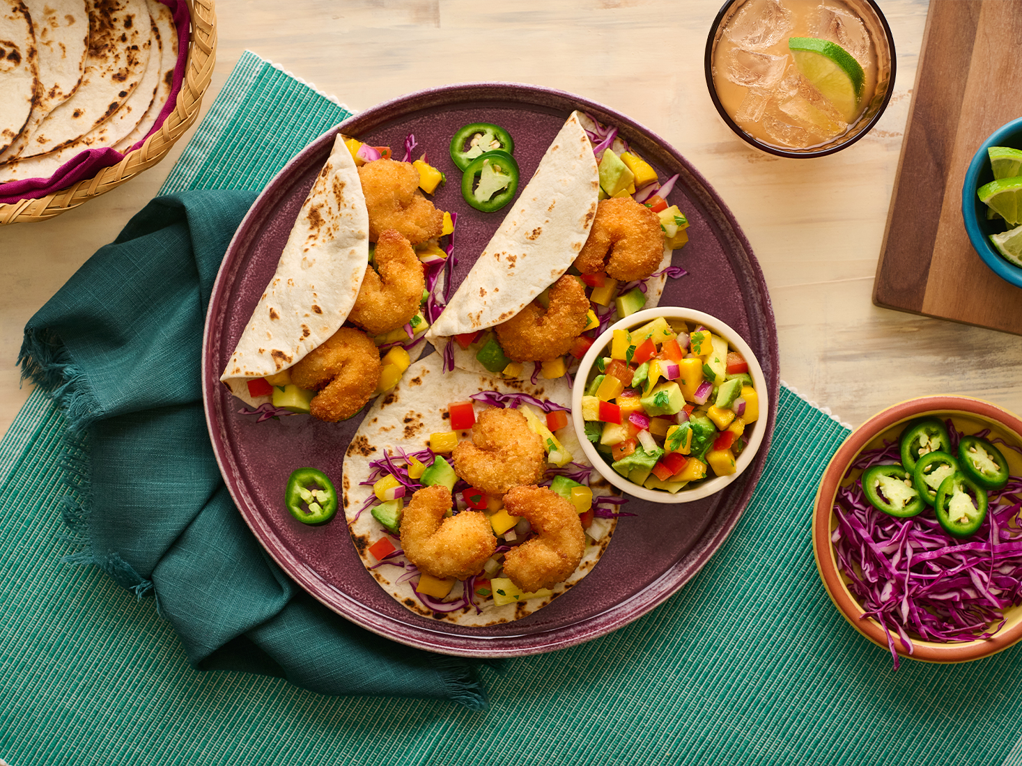 Gorton’s Double Crunch Shrimp pairs deliciously with mango salsa, purple cabbage and flour tortillas for a bright, tasty, and easy taco night.